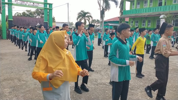 Senam pagi tersebut berlangsung dengan suasana meriah dan penuh semangat. Tidak hanya para siswa yang berpartisipasi, seluruh majelis guru, baik laki-laki maupun perempuan, juga turut serta dalam barisan senam. Kehadiran guru dan siswa secara bersama-sama menciptakan suasana kebersamaan yang hangat di lingkungan sekolah.