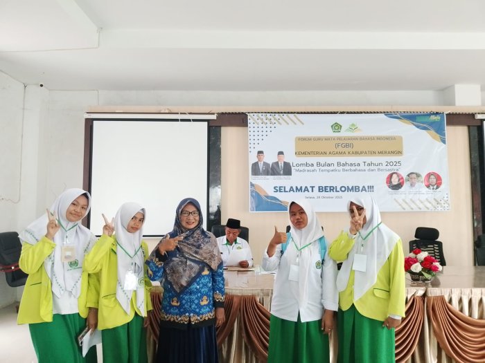 MTsN 1 Merangin, (30/10/2025)_Pada Selasa, 28 Oktober 2025, Forum Guru Bahasa Indonesia (FGBI) Kementerian Agama Kabupaten Merangin mengadakan Lomba Bulan Bahasa Tahun 2025. Adapun cabang lomba untuk tingkat Mts adalah Pembawa Acara/ MC dan Mading. Keikutsertaan MTsN 1 Merangin tidak tanggung-tanggung. Mengutus lima peserta MC dan lima tim Mading. Jumlah tersebut merupakan jumlah maksimal yang boleh diikuti oleh satu madrasah. Selanjutnya peserta lomba juga didampingi oleh sepuluh guru.