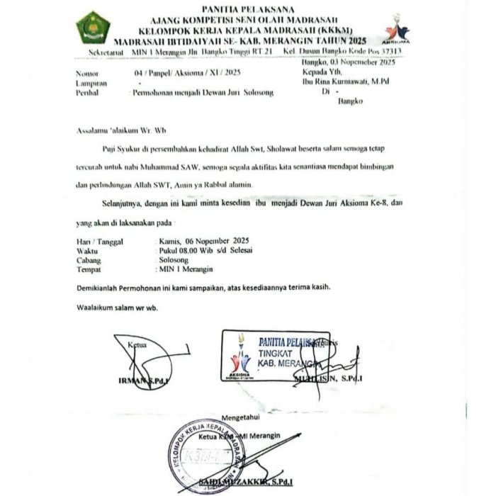 Berdasarkan surat yang masuk ke MTsN 1 Merangin Nomor: 04/Panpel/Aksioma/XI/2025, Ibu Rina Kurniawati, M.Pd. dimohon untuk menjadi juri lomba solosong. Dengan pengalaman beliau di bidang seni serta pendidikan, Ibu Rina berkapasitas memberikan penilaian objektif terhadap teknik vokal, intonasi, penghayatan, dan penampilan peserta di atas panggung.