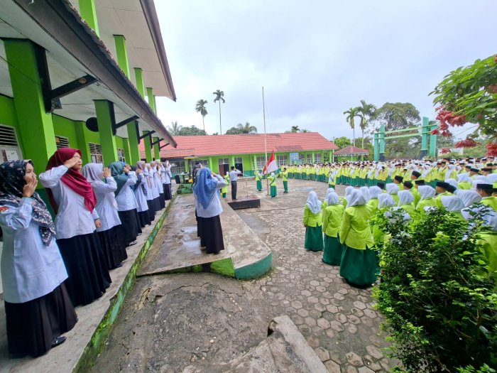 MTsN 1 Merangin, (12/1/2026)_Upacara bendera rutin yang berlangsung tertib dan khidmat di halaman madrasah. Suasana sejuk dan mendung menyelimuti lapangan utama MTsN 1 Merangin, tidak membuat turun semangat melaksanakan upacara. Pada kesempatan ini, petugas upacara adalah peserta didik Kelas VII E dengan wali kelas Ibu Rosnimar, S.S. Para petugas mempersiapkan diri dengan baik sehingga pelaksanaan upacara berlangsung lancar. Meskipun ada beberapa perbaikan untuk dijadikan pelajaran bagi petugas selanjutnya.